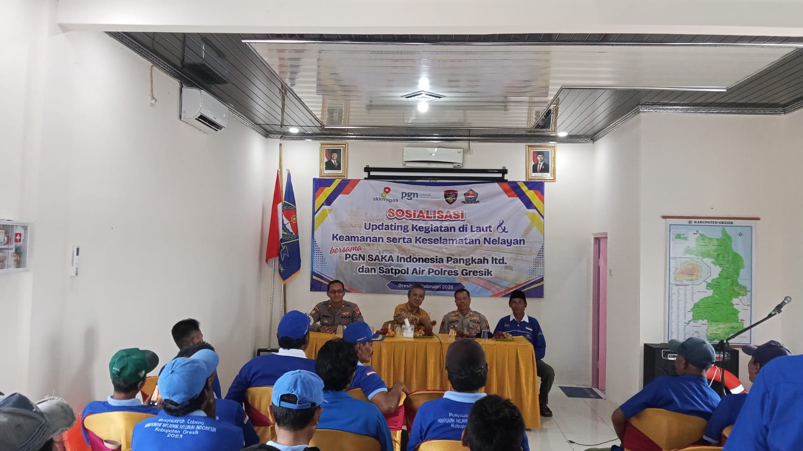 Kepala Satuan Polairud Polres Gresik, AKP I Nyoman Ardite, S.H., M.H. memimpin langsung acara yang menghadirkan 35 ketua Rukun Nelayan dari tujuh kecamatan se-Kabupaten Gresik. Turut hadir dalam kegiatan tersebut Kepala Kepolisian Sektor Ujungpangkah Iptu Suwito Saputro, perwakilan dari PGN Saka Indonesia Pangkah Limited, serta jajaran pengurus DPC HNSI Kabupaten Gresik. Kegiatan ini merupakan kolaborasi antara Polairud Polres Gresik bersama PGN Saka Indonesia Pangkah Limited dan DPC HNSI Kabupaten Gresik.